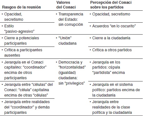 La reunión contribuye a la construcción utópica de tres formas. A nivel primario funge como esqueleto del Conaci capitalino, aportando estructura a la acción colectiva; canaliza y coordina las prácticas que articulan al grupo, y les da sentido como “grupo”. En segundo lugar, una parte sustantiva de ese sentido está relacionada con la narración utópica. Las críticas al “partidismo”, el deseo de cambio político y la transformación del sistema político hacia el “apartidismo” conforman ejes de las discusiones en estos encuentros. Sin embargo, tercero, esta práctica revela contradicciones entre, por un lado, el discurso utópico pospartidista y, por el otro, los comportamientos que niegan esa utopía. La Tabla 4 resume los rasgos que reproducen, en el seno de la reunión, las percepciones negativas del Conaci sobre los partidos políticos. En general, los participantes no parecen estar conscientes de estos contrasentidos o, al menos, no se quejan de ellos.