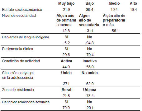 Los resultados demuestran la particular vulnerabilidad y rezago de la salud sexual y reproductiva en la población adolescente, que están particularmente acrecentados en la de origen indígena. Con la finalidad de caracterizar a la comunidad de estudio, en el cuadro 1 se presentan las características sociodemográficas de todas las mujeres de 20 a 29 años (sexualmente iniciadas o no). De éstas, el 37.1 por ciento se unieron en la adolescencia. También sobresale que la mayoría se concentran en el estrato bajo (39.4 por ciento) y muy bajo (21.9 por ciento) lo que evidencia condiciones poco favorables al desarrollo de proyectos de vida alternativos a la maternidad y a las uniones tempranas. A su vez, 5.2 por ciento (n=1521) son hablantes de lengua indígena, y 29.6 por ciento se declaran con pertenencia étnica (n=8120) . Sobresale que poco más de la mitad de las mujeres encuestadas contaban con preparatoria o más y el 79.9 por ciento son sexualmente iniciadas -han tenido relaciones sexuales alguna vez en su vida-.