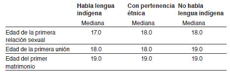 Así, se observa una heterogeneidad importante entre estas mujeres según los distintos eventos demográficos. Una diferencia relevante es la edad mediana en la que tuvieron su primera relación sexual las hablantes de lengua indígena -17 años-, donde ésta se presenta un año antes que entre las jóvenes con pertenencia étnica y las no hablantes de lengua indígena -18 años-; y un año después en las no hablantes de lengua indígena -19 años- en comparación con todas las demás -18 años-. Finalmente, la edad mediana del primer matrimonio es la misma en las tres categorías analizadas -19 años- (cuadro 2).