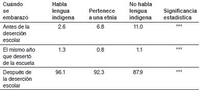 Por el contrario de lo que comúnmente se asume, y como ha sugerido la literatura especializada en el tema, el embarazo en la adolescencia tiende a ocurrir en contextos como el de la población analizada, en forma posterior a la deserción escolar. En las mujeres con pertenencia étnica y en las hablantes de lengua indígena tuvo lugar, respectivamente, en el 92.3 y el 96.1 por ciento después de haber abandonado la escuela, descendiendo a 87.9 por ciento entre las jóvenes no indígenas.