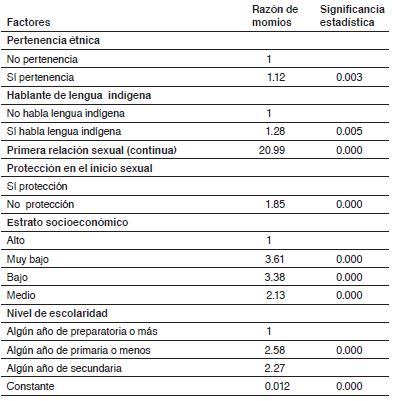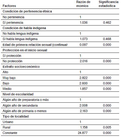 Si analizamos los factores que condicionan haberse o no embarazado en la adolescencia (cuadro 5), vemos que todas las variables tienen una relación importante con la posibilidad de embarazo en la adolescencia, salvo la de las mujeres hablantes de lengua indígena y la de pertenencia étnica, ya que no mostraron una relación estadísticamente significativa con dicho evento.