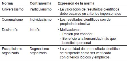 Por otra parte, cuando las prácticas ya no se refieren únicamente al método científico o a su transmisión, sino que involucran su evaluación o dictaminación, por ejemplo, para la publicación, sucede que normas como la actuación desinteresada del científico son poco percibidas, porque en esos procesos les resulta más claro, sobre todo a los investigadores de ciencias sociales, que intervienen intereses personales o de grupos. En tales casos, las contranormas, como el particularismo y el individualismo, adquieren relevancia, aunque a veces pasen inadvertidas para los mismos investigadores, por ejemplo, en prácticas relacionadas con la comercialización del conocimiento y el desarrollo de los campos disciplinarios.