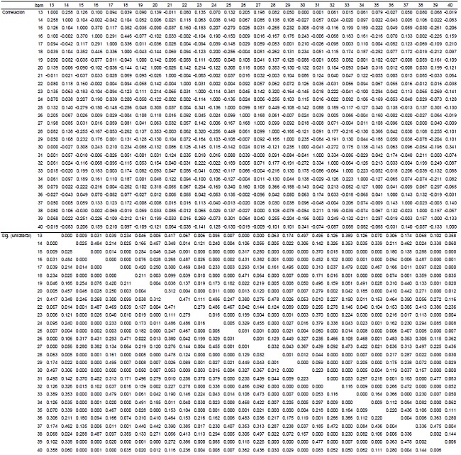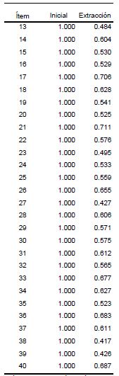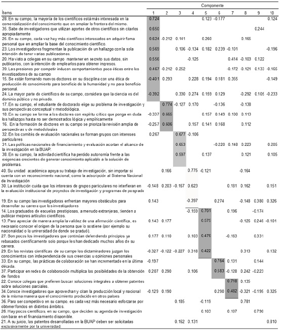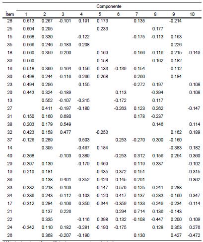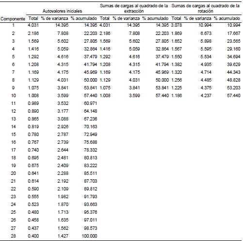 Finalmente, se generó una matriz de componentes rotados que agrupa y ordena los ítems por factores o constructos que explican las correlaciones entre los ítems, la cual es presentada en la segunda parte de la sección de resultados ( tablas 6 y 7).