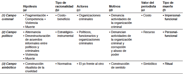 Por ello, al echar mano de estas razones argumentativas es posible construir un modelo teórico que incorpore dos tipos de racionalidad (una de costo-beneficio y otra estratégica e instrumental), que aporten argumentos a la explicación de los asesinatos de periodistas. Ambas racionalidades se despliegan dentro de un campo criminal que se encuentra en un proceso de fragmentación de sus organizaciones y dentro de un campo político inmerso en uno de alternancia partidista. Más todavía, sostenemos que ambas lógicas se traducen, empíricamente, en un tipo de ejecución específico. La racionalidad costo-beneficio desembocaría en una muerte impersonal-funcional. La dimensión estratégico-instrumental propiciaría más bien una muerte personal-funcional. El primer caso significa que el crimen es menos violento. Es decir: en el asesinato no se muestran elementos de crueldad, dado que la víctima sólo representa un costo para el victimario. Aquí estamos frente a una muerte impersonal-funcional. En el segundo, es posible que la víctima haya mantenido vínculos estratégicos con el victimario, o que sea un instrumento de venganza o de comunicación de la violencia, por lo que al homicidio subyace la represalia y, por tanto, muestra signos de crueldad. Aquí estamos frente a una muerte personal-funcional.