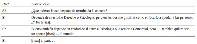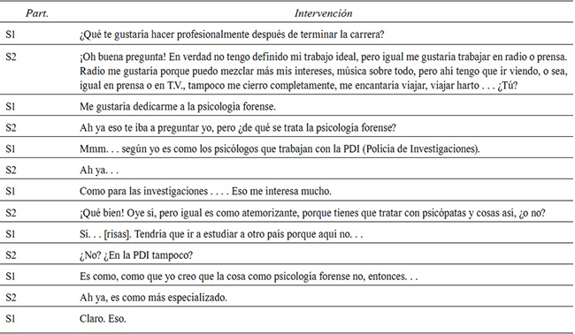El primer segmento se inicia con un turno comuni cativo en el cual S1 pregunta acerca de las actividades en las que le gustaría desempeñarse luego de terminar la ca rrera profesional. Aquí emerge el complejo de significado [HACER / NO-HACER]. En la siguiente expresión comu nicativa, el interlocutor comenta “¡Oh buena pregunta!”, posicionándose subjetivamente en la interacción dialógica y expresando su disposición a dialogar respecto a ese tó pico. A través de esta misma expresión comunicativa, el interlocutor construye el complejo [TRABAJO IDEAL / NO-TRABAJO IDEAL], refiriendo que aún no define su trabajo ideal dentro del área del periodismo. Comenta su interés de trabajar en radio o prensa ya que puede desarro llar su interés por la música, posicionando su subjetividad en el diálogo. Es un turno comunicativo dominado por la tensión, expresado a través del mecanismo semiótico “pero”, el cual confronta dos partes del diálogo: sus in tereses con sus reales posibilidades. S2 finaliza el acto comunicativo comentando que también le gustaría un trabajo en el cual pudiera viajar; así, expone un segundo aspecto del sí mismo un mismo turno comunicativo. S1 no toma ninguno de estos significados construidos por el S2, y dice que le gustaría dedicarse a la psicología fo rense, produciendo crecimiento del complejo de signifi cado [TRABAJO IDEAL / NO-TRABAJO IDEAL] en el polo [A]. Ante la respuesta de S1, S2 se detiene y muestra interés por su interlocutora, expresando la pregunta “Ah ya eso te iba a preguntar yo, pero ¿de qué se trata la psicología forense?” Se establece una micro-secuencia de intercambio comunicativo en la cual S1 intenta explicar a S2 en qué consiste la psicología forense: el trabajo de los psicólogos en la Policía de Investigaciones (PDI). En este movimiento se aleja del signo construido al decir “los psicólogos” des-identificándose de ellos. En la siguiente expresión comunicativa, S1 vuelve a identificarse con el signo al decir “eso me interesa mucho”. Este intercambio muestra un proceso de coconstrucción en la cadena de significados, que genera crecimiento en el campo [A] del complejo de significado. En el siguiente turno comuni cativo, S2 pierde distancia con el significado focalizado identificándose con él y permitiendo la emergencia del significado “MIEDO”. En este movimiento S2 aumenta la tensión, pero se contacta con la emoción de trabajar como psicólogo en la PDI, con lo cual logra empatizar con la vivencia subjetiva que el interlocutor intenta comunicar. S1 no toma el significado y disminuye la tensión a través de la expresión comunicativa “tendría que ir a estudiar a otro país”, S2 realiza una intervención para compren der si en la PDI puede realizar la formación en psicología forense, ante lo cual S1 responde que no. S2 plantea “ah ya, es como más especializado”; S1 asiente y finaliza el primer segmento.