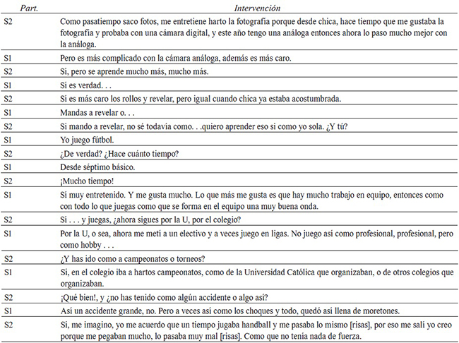 Al final de la secuencia, ante la respuesta en la cual S1 refiere que no ha sufrido accidentes pero sí presenta he matomas en sus piernas, S2 realiza un movimiento dialógico en el cual se identifica con el significado construido; de esta manera, refiere que cuando jugaba handball le sucedía lo mismo, en coherencia con la experiencia subjetiva del otro.