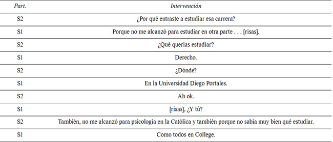 En el tercer segmento se evidencia una micro-se cuencia correspondiente a una interacción no empática. Se aprecia un intercambio de intervenciones informativas con respuestas breves. Ante la respuesta de S1 no se aprecia una indagación de la experiencia subjetiva por parte de S2. En la siguiente secuencia se aprecia una interacción dialógica entre los hablantes dominada por la tensión. Se observa como S2 a través del movimiento “Ah ok” se dis tancia del significado focalizado que S1 está comunicando, abandonando el campo de significado y dando término a la conversación sin profundizar en la experiencia interna del otro. Sin embargo, S2 genera la expresión “también” dando cuenta de que su experiencia es similar. A pesar de esto no se evidencia una conexión emocional entre los participantes. Esto debido a que inmediatamente después, en el turno comunicativo siguiente, S1 realiza la expresión comunicativa “Como todos en College”, como una estrate gia de generalización y de distanciamiento a través de una estrategia semiótica de hacer referencia a otro abstracto o a una generalidad, estrategia que permite disminuir la ten sión y finalizar la micro-secuencia.
