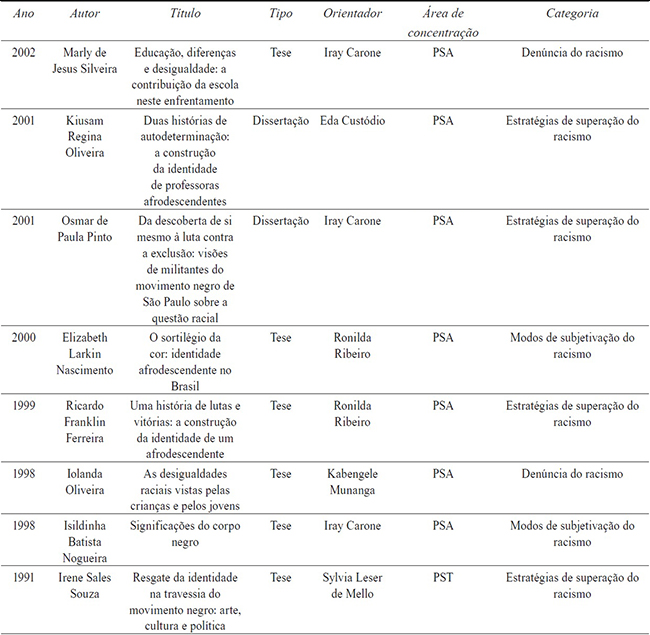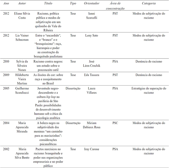 O quadro mostra que somente três áreas de concentração (PSA, PST e PSC) têm trabalhos relacionados ao tema da raça, relações raciais e do racismo 6 e suas variações, como: identidade negra, movimento negro, branquitude etc.