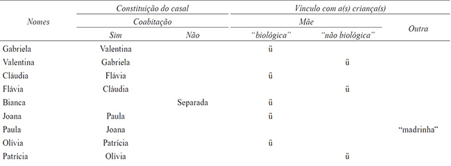 Dentre as nove participantes, oito se autodenominaram mães (cinco são “mães biológicas” e três são “mães não biológicas”, e uma “madrinha” das crianças. Assim, na Tabela 1, na qual os nomes das mães são fictícios, temos as configurações familiares homoparentais estudadas neste trabalho: “mãe biológica”/ “mãe não biológica”/filho(s) e mãe/“madrinha”/filho.