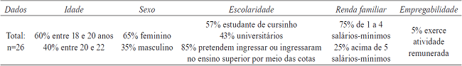 Participaram deste estudo 11 estudantes de uma universidade pública do interior do estado de São Paulo e 15 de um cursinho popular localizado na mesma cidade. Trata-se de um cursinho gratuito que atende somente estudantes de escolas públicas e é subsidiado pela referida universidade pública, que, por meio de verbas de extensão universitária, fornece espaço físico e estrutura material e pedagógica para seu funcionamento.