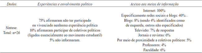 Destes dados é possível reconhecer que se trata de uma população jovem, que, em geral, ainda não ingressou no mundo do trabalho (95% sem atividade remunerada) e não teve intensas vivências no campo da política (apenas 10% dos entrevistados, todos estudantes universitários, afirmaram participar do movimento estudantil, entidades ou coletivos políticos). Estas características, certamente, interferem no modo de enxergar o mundo e o universo político ao redor, parecendo, estes, serem dimensões ainda muito abstratas aos participantes.
