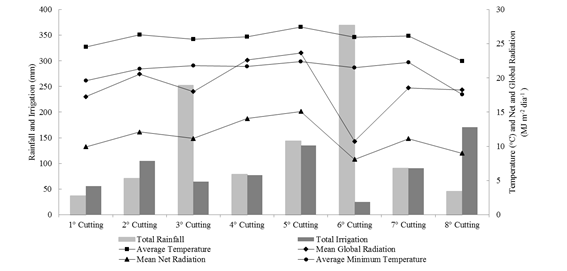 Cuttings were performed manually, 15 cm above the ground in the center of the subplots, in an area of 1.0 m2. The intervals between cuttings ranged from 28 to 32 days in the rainy season, and 40-45 days in the dry season. The remaining biomass in the area was mechanically mowed, removed from the plot, and then N was applied to the subplots.