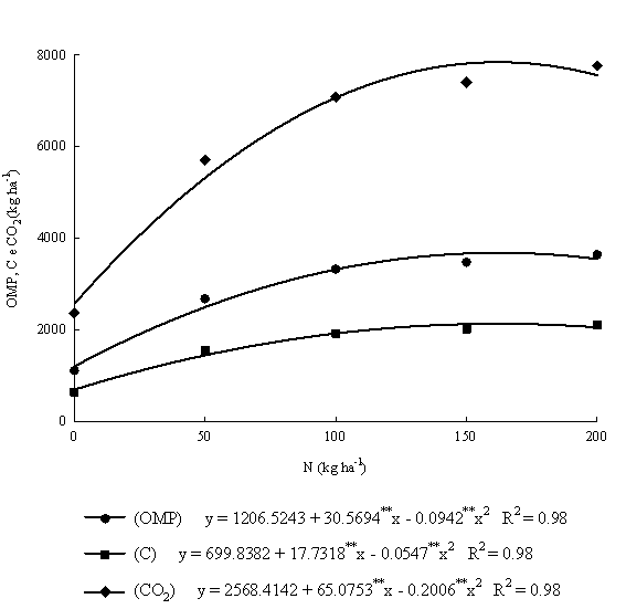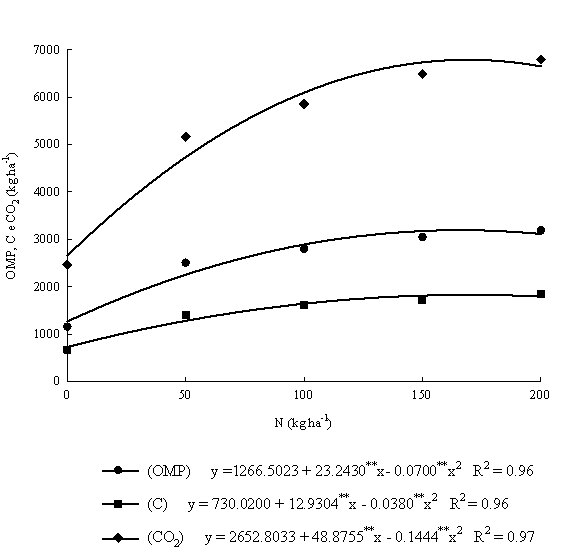 There was no significant interaction (p > 0.05) between N and seasons in the irrigated experiment due to the inexistent water restriction, which is the main limiting factor for DMP in the dry season. However, N supply provided a quadratic increase in OMP and C and CO2 sequestration by marandu grass (Figure 2). It is known that N is the nutrient that most influence plant growth (Rezende et al., 2015), increasing plant DMP linearly up the point where other growth factors become limiting. Thus, OMP and sequestration of C and CO2 reflected the effect of N on DMP when there was adequate water availability.