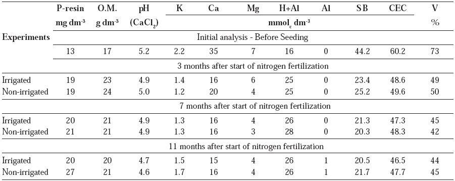 The experiments were conducted in a Typic Dark soil, eutrophic, sandy texture (Empresa Brasileira de Pesquisa Agropecuária - EMBRAPA, 2013), at the UNESP - Universidade Estadual Paulista "Júlio de Mesquita Filho" in Teaching and Research Farm, Ilha Solteira - SP, located on the left bank of the Parana River (20º 21' S and 51º 22' W), 326 m altitude, in an area previously occupied by Panicum maximum Jacq. cv. Colonião undergrazed. Table 1 shows the soil chemical analyzes carried out during the experiment.