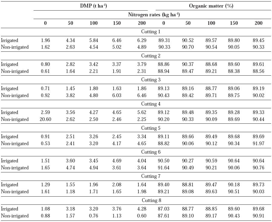 Therefore, this study aimed to evaluate the accumulation of carbon (C) and carbon dioxide (CO2), based on dry matter productivity (DMP) and organic matter content (OM) of marandu grass (Brachiaria brizantha Stapf. cv. Marandu) under N rates and irrigation in the Cerrado Paulista during the rainy and dry seasons.