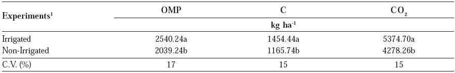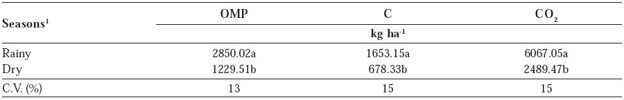 Table 3 shows the effect of season in OMP, accumulation of C and accumulation of CO2 by marandu grass in the non-irrigated experiment. There was higher (p < 0.05) OMP and sequestration of C and CO2 in the rainy season due to increased water availability (> 900 mm) compared with the dry season (< 200 mm) (Figure 1). The water stress affects various physiological processes of plants, generally increasing the stomatal conductance, reducing perspiration and hence the CO2 supply to perform photosynthesis (Taiz & Zeiger, 2009). Therefore, biomass production and C sequestration by plants are compromised in environments with low water availability, even when there is adequate nutrient supply.