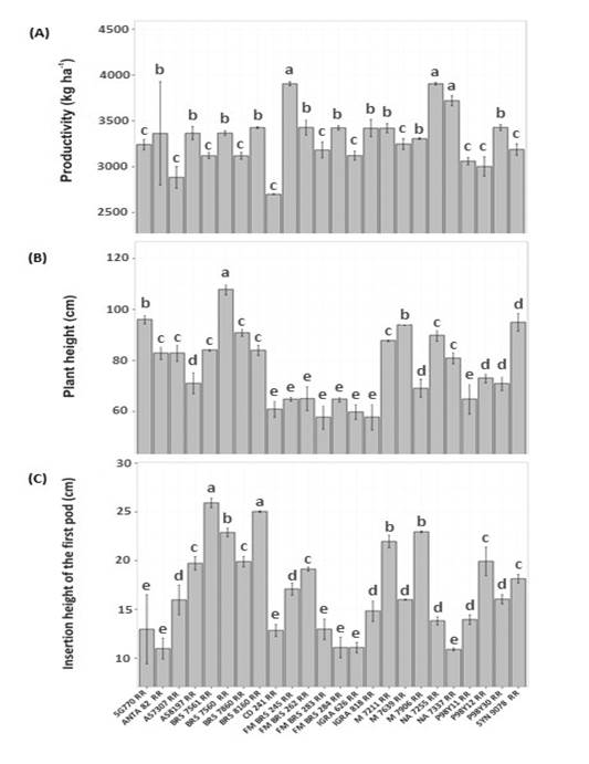 It is observed in Figure 1, a genotypic variation in grain yield (kg ha-1), height (cm) and the height of insertion of the first pod (cm) among the studied soybean cultivars.