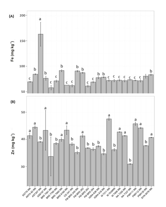Considering grain yield (kg ha-1), plant height, insertion height of the first pod, concentrations of iron, zinc, phosphorus and antinutrient phytate in grains, simultaneously, cultivars AS 8197RR, M 7908RR and BRS 262 FMS were more suitable for biofortification.