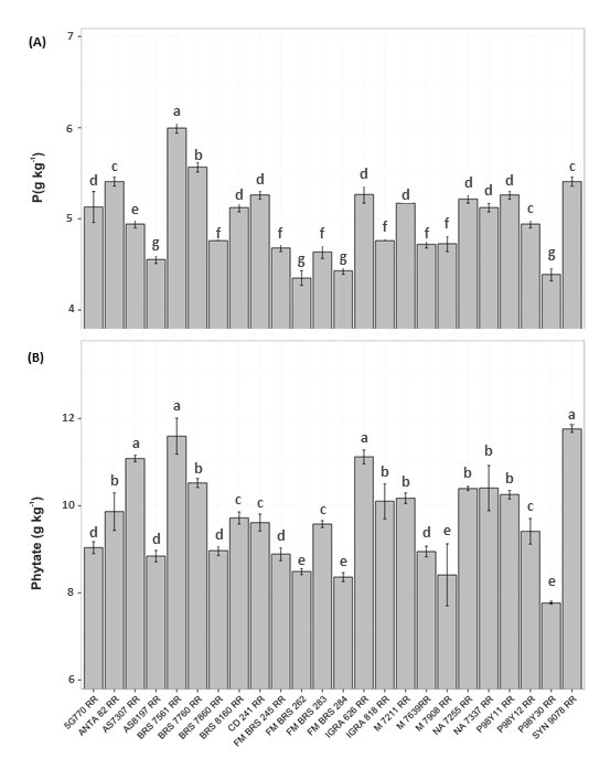 It was also evaluated the concentration of P in the soybean cultivars in the study because of the existence of a high correlation between the concentration of total P and phytate in seeds, as evidenced by Raboy et al., 1984; Raboy & Dickinson, 1993. It is noted in Figure 3 that among cultivars, genotypic variation in the phosphorus concentration in the grains was approximately 27% (from 4.35 to 6.00 g kg-1) with average values 4.99 g kg-1 of P in the grains.