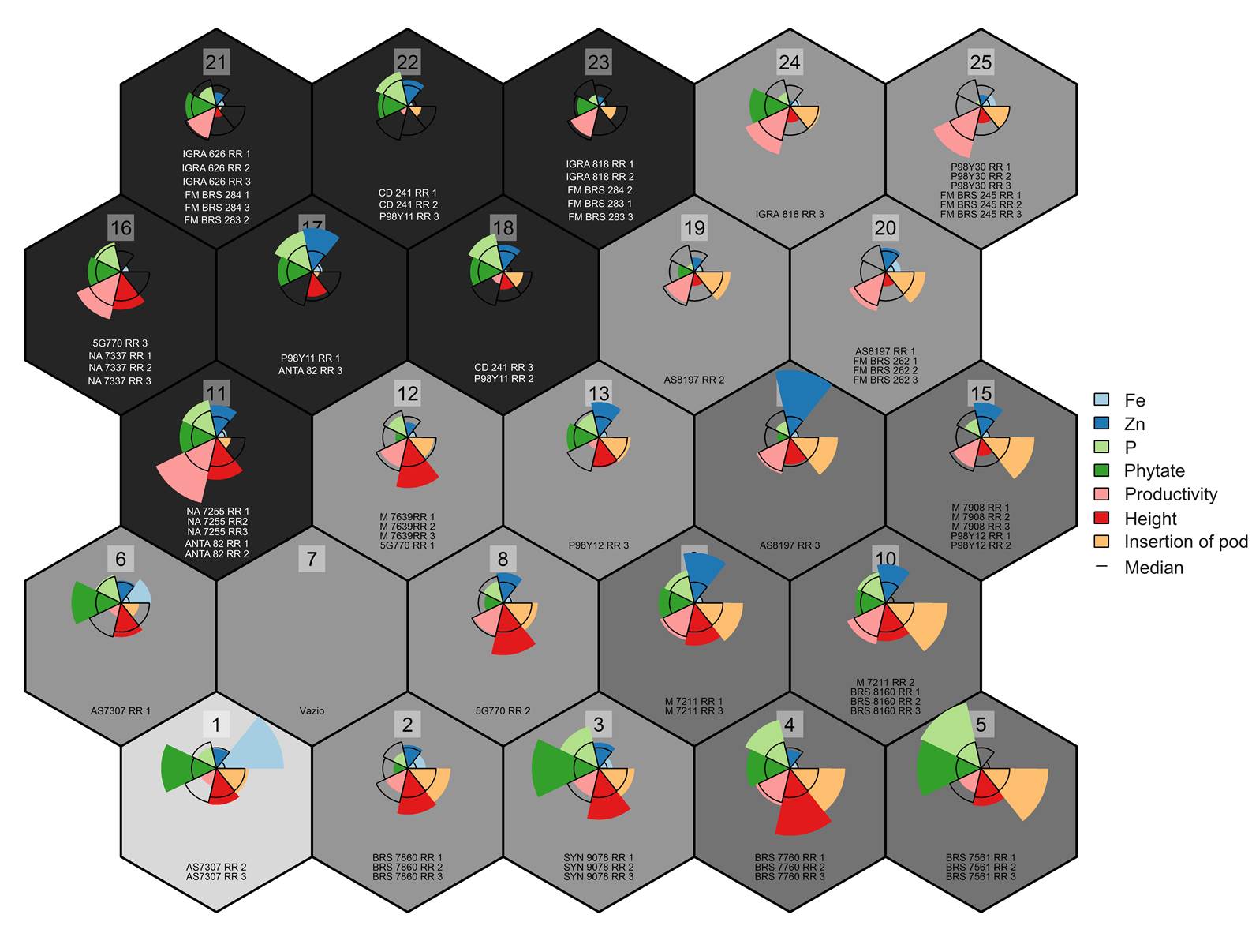 Thus, it is observed, in Figure 4, that when evaluating simultaneously the genotypic variation among soybean cultivars for agronomic characteristics (yield, plant height, insertion height of the first pod) and for the nutrient content (Fe, Zn and P) and antinutrient phytate, it was possible to identify three soybean cultivars that best meet the above mentioned requirements and, hence, have the potential for biofortification, which are these two transgenic soybean cultivars Roundup Ready(r) (AS 8197RR and M 7908RR) and a conventional soybean (FMS BRS 262.