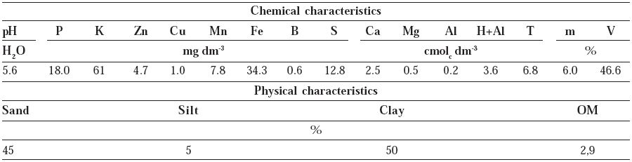 The fertilizer used at planting was 400 kg ha-1 of 02-20-18 formulated. The cultural practices were carried out according to CTCo protocol. Composite sample of soil was collected at 20 cm depth, to characterize the chemical and physical properties (Table 1), according to the methodology described by Souza et al., 2011. The rainfall during the experiment was 1,042 mm.