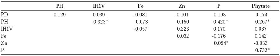 It is observed, in Table 2, low or no significant correlations among the evaluated variables, except for the relationship between P and phytate (r = 0.733), which is a value below those (r = 0.94) and (r = 0.99) found by Lolas et al., (1976), and Raboy et al., (1984) in soybean seeds. This relatively high correlation is possibly due to the fact that phytate represent 50-85% of total phosphorus in seeds (Thavarajah et al., 2010; Golam Masum Akond et al., 2011).