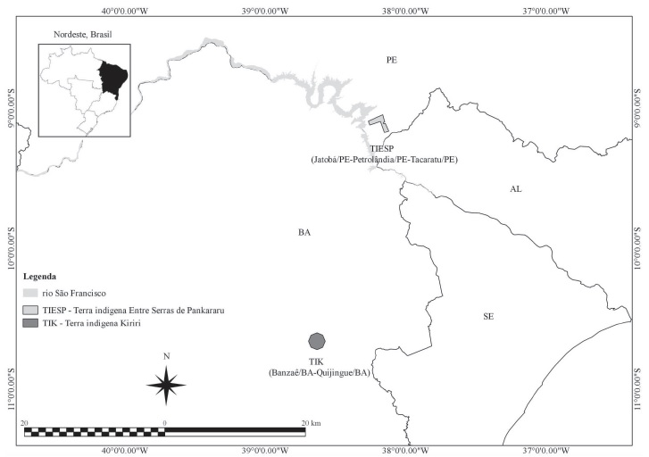A área de estudo é composta por duas áreas de terras indígenas, localizadas no semiárido do nordeste Brasileiro, sendo uma no Estado de Pernambuco e outra no Estado da Bahia. As terras indígenas estudadas foram Entre Serras de Pankararu (situada nos municípios de Jatobá, Petrolândia e Tacaratu, Estado de Pernambuco, mesorregião do São Francisco), e Kiriri (localizada nos municípios de Banzaê e Quijingue, ambos situados no norte do Estado da Bahia) (Figura 1).