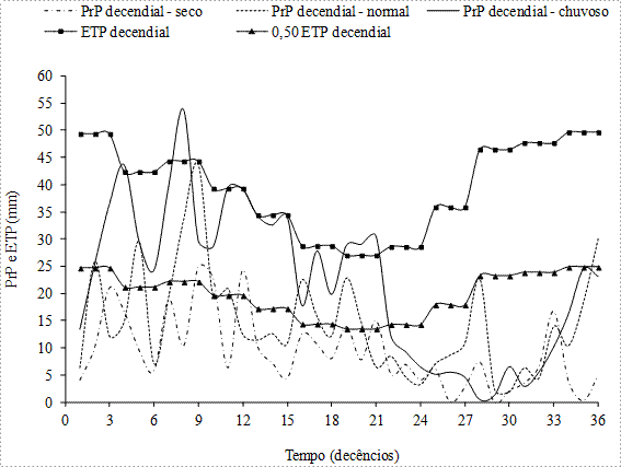 Conforme Moura et al. (2010), na avaliação da estação de crescimento, os dados médios diários de precipitação foram acumulados em períodos decendiais para traçar a curva média da precipitação, juntamente com as curvas médias decendiais da evapotranspiração potencial e da metade dessa mesma evapotranspiração, obtendo-se os três subperíodos: pré-úmido (durante o qual a precipitação permanece abaixo da evapotranspiração potencial), úmido (a precipitação média sobrepõe-se à evapotranspiração potencial), e pós-úmido (correspondente a uma redução e final das chuvas (nesse período, a precipitação é superada pela evapotranspiração potencial). Nos meses de 31 dias, considerou-se o último decêndio com 11 dias e, no mês de fevereiro, o último decêndio com oito ou nove dias.