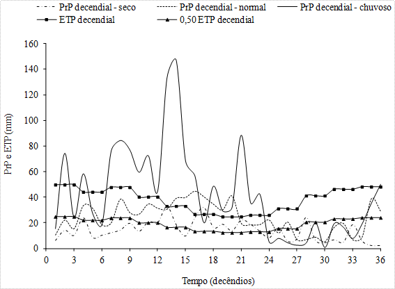 Nessa localidade, considerando-se o cenário seco, a estação chuvosa ocorre entre os meses de janeiro e agosto (início em 31/01 e término em 21/08), cuja duração é de 203 dias, com precipitação pluviométrica de 367,8 mm. Na Figura 3, verifica-se que a evapotranspiração potencial foi sempre superior à precipitação, exceto no décimo sétimo decêndio, quando a precipitação atingiu um pico de 31,9 mm e ultrapassou a ETP. Observa-se, ainda, que a precipitação atingiu valores máximos equivalentes a 32,8; 24,0 e 24,4 mm, no décimo terceiro, décimo sexto e vigésimo oitavo decêndios, respectivamente. Essa variabilidade e irregularidade da precipitação, nos primeiros decêndios dos anos secos, também foi verificada por Moura et al. (2008), em pesquisa para determinar o início, a duração e o final de cada período de chuva, além da estação de crescimento da cultura da cana-de-açúcar, em três cenários distintos, para o município de Itambé, PE, região da Mata Norte de Pernambuco.