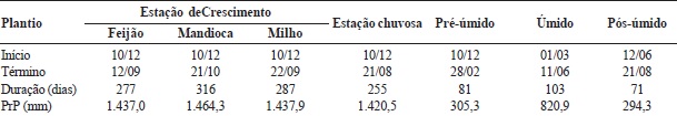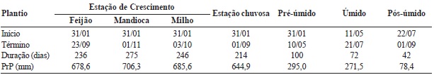 O período de desenvolvimento vegetativo das culturas, que é de 40 dias, para o feijão-caupi (Campos et al., 2010); 175 dias, para a mandioca, considerando-se apenas um ciclo vegetativo (Gonzales et al., 2014), e 105 dias, para o milho (Doorenbos & Kassam, 1994) que é o de maior exigência de água entre esses três cultivos. O suprimento hídrico dar-se-á no subperíodo úmido, o que leva a caracterizar esse período como sendo o da fase de desenvolvimento vegetativo. A partir do subperíodo pós-úmido, as culturas entram na fase de maturação (15 dias, para o feijão-caupi, 180 dias, para a mandioca com um ciclo vegetativo e 10 a 15 dias, para o milho) e, por necessitarem de pouca água, coincide com o período de baixa precipitação pluviométrica (PrP).
