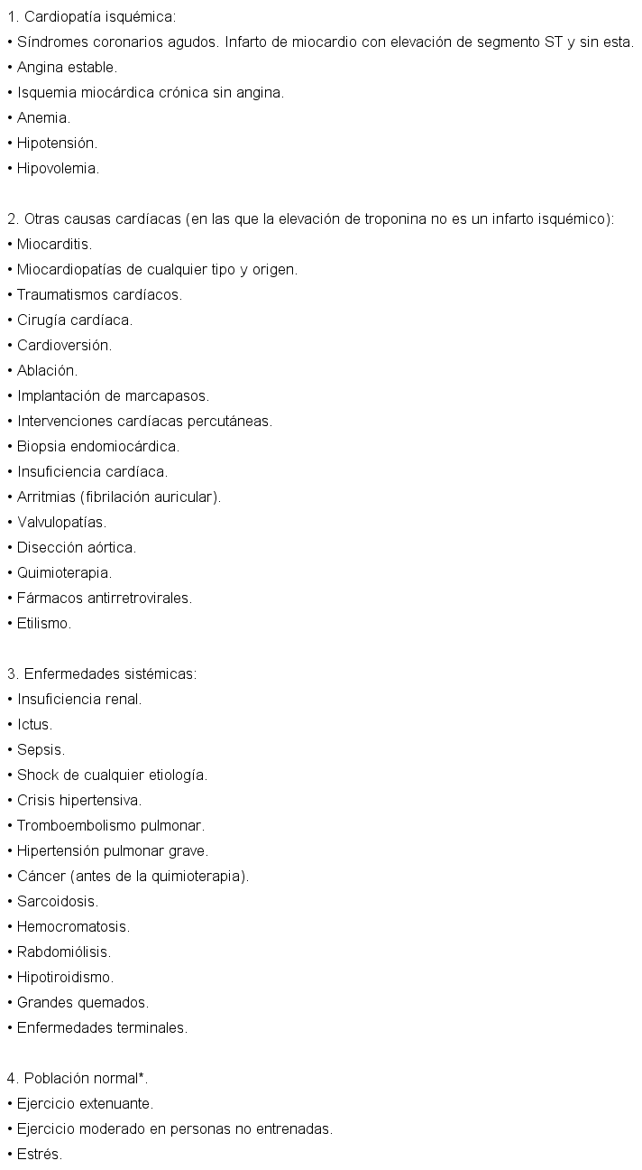 El mayor inconveniente de las troponinas de alta sensibilidad es la falta de especificidad en el diagnóstico del síndrome coronario agudo.El primer problema con las troponinas ultrasensibles es que pueden ofrecer valores más altos que lo "normal" en multitud de situaciones clínicas; tanto más cuanto mayor es la sensibilidad del método para su detección (Tabla1). El motivo del aumento de troponinas cardíacas en enfermedades sistémica y en patología cardíaca no isquemiaes múltiple y variado.(3) En algunos casos, como en las miocarditis, la toxicidad por quimioterapia o en enfermedades infiltrativas es por daño directo en los miocardiocitos; en otras ocasiones es la sobrecarga ventricular secundaria a un aumento del estrés ventricular (sobrecargas de presión y de volumen), como puede suceder en algunas valvulopatías, en la hipertensión arterial, la insuficiencia cardíaca y en la insuficiencia renal. Otras situaciones incluyen la anemia, hipotensión sepsis, ictus, diabetes, en las que la causa es multifactorial. Por este motivo,para el diagnóstico de infarto (o síndrome coronario agudo sin elevación del segmento ST) exige constatar el aumento y disminución de los valores de troponina. (4)