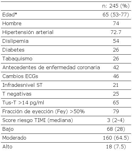 Aclaraciones: *Edad años (mediana, RIC 25%-75%). Antecedentes de enfermedad coronaria: incluye infarto y procedimientos de revascularización previos (angioplastia o cirugía coronaria); Tus-T: troponina T ultrasensible; Fey: Fracción de eyección medido por ecocardiografía al ingreso. Score TIMI bajo: 0-1; mediano: 2-5; alto: 6-7. Valores expresados en porcentajes.