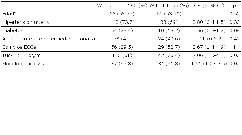 La edad (mediana) fue de 65 años y el 74% fueron de género masculino. Se observaron cambios ECG en 110/245 pacientes (46%) y la Tus-T elevada se registró en el 65% de los pacientes. El índice de riesgo clínico TIMI fue 3. (2, 3, 4) Se efectuó cinecoronariografía en el 39% (96/245 pacientes) a los (mediana) 4 días (RIC 3-5); fue revascularizado el 80% de ellos (64,5% mediante angioplastia y 15,5% cirugía de revascularización miocárdica). Los motivos principales fueron angina recurrente espontánea 20,4% (50 pacientes), prueba funcional positiva 17,5% (43 pacientes) e infarto 1,2% (3 pacientes). El punto final primario se produjo en un 22,4% (55/245 pacientes): angina recurrente, 20,4% (50 pacientes); infarto tipo Q, 4 pacientes (1,6%); y muerte total, 1 paciente (0,4%). En el análisis univariado, los pacientes con EH tuvieron mayor frecuencia de cambios en el ECG, Tus-T positiva y un puntaje del modelo de riesgo clínico >2 (Tabla 2).