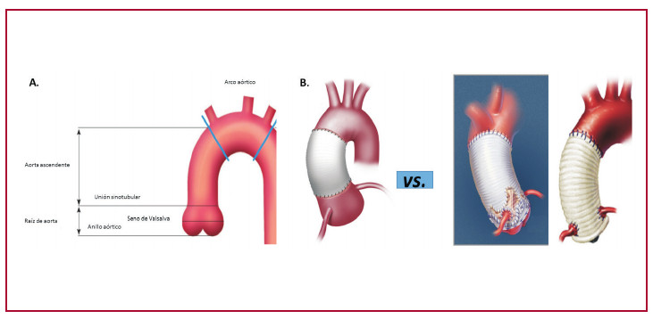 Fig. 1. A. Anatomía de la raíz de la aorta y de la aorta ascendente B. Representación esquemática del estudio: se comparó el reemplazo de la aorta ascendente con preservación de la raíz (sector izquierdo) frente al reemplazo de la aorta ascendente y la raíz de la aorta, con el consiguiente reimplante coronario en la prótesis (sector derecho), ya sea con la técnica de preservación valvular (operación de Tirone David o de Yacoub) o con un tubo valvulado protésico.