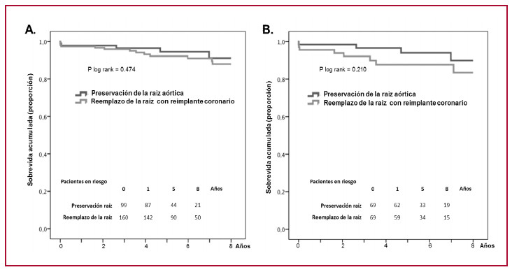 Fig. 2. Estimación de supervivencia de Kaplan-Meier a 8 años en la población completa (A) y en una subpoblación ajustada por score de riesgo (B) en función del tipo de cirugía: conservación de la raíz aórtica frente al reemplazo de la raíz aórtica.