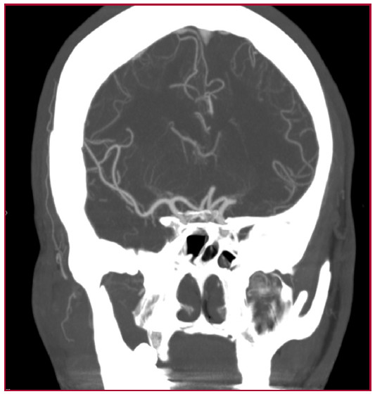 Fig. 1. Angiotomografía computada de inicio (vista coronal) que muestra oclusión completa del segmento M1 de la arteria cerebral media izquierda.