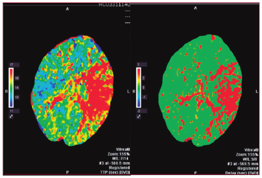 Fig. 2. Imágenes de la TC-perfusión que muestran una amplia zona isquémica en el territorio de la oclusión de la ACM izquierda, con volumen sanguíneo cerebral conservado que indica la persistencia de tejido recuperable.