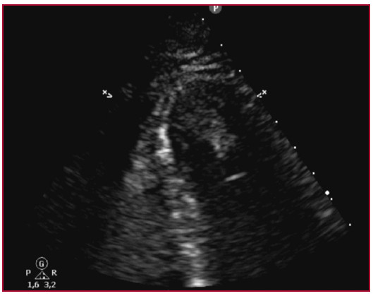 Como parte del protocolo de diagnóstico, se realizó ecocardiograma transtorácico, que reveló acinesia apical del ventrículo izquierdo con trombo intraventricular de 2.2 × 1.2 cm (Figura 3) en zona apical. Se le administró tratamiento anticoagulante con heparina de bajo peso molecular y dosis baja de aspirina.
