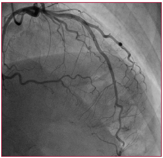 Durante una nueva entrevista sobre su situación cardíaca una vez recuperada de la afasia, la paciente negó haber tenido algún síntoma relacionado con el corazón antes del inicio del accidente cerebrovascular (ACV). Se realizó una coronariografía a los 7 días, que mostró arterias coronarias izquierda, circunfleja y derecha normales. La gran arteria descendente anterior (DA) izquierda recurrente, sin evidencia de aterosclerosis, presentaba una disección no oclusiva en su segmento apical (Figura 4). Dado que la disección afectaba un segmento distal y que no había evidencia de obstrucción limitante del flujo, se decidió por un tratamiento médico conservador sin intervención coronaria.