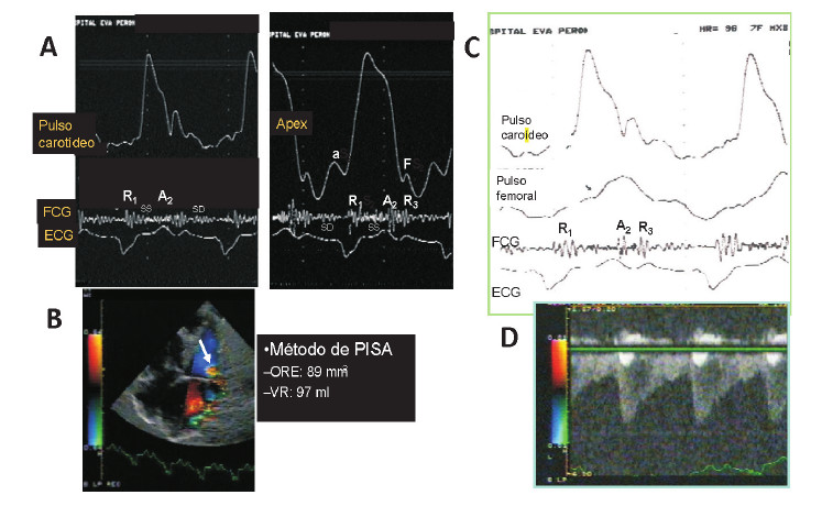 A) registro simultáneo de fonocardiograma (FCG) en área mitral, electrocardiograma (ECG), carotidograma (izquierda) con forma “triangular” y apexcardiograma (derecha) con onda protodiastólica “F” simultánea con el R3 y onda “a”. SS: soplo sistólico, SD: soplo diastólico de hiperflujo mitral. B) vista de 4 cámaras apical evidenciando aceleración proximal (PISA, -flecha-) del jet de insuficiencia mitral excéntrico, que se adhiere a la pared lateral de la aurícula izquierda; ORE: orificio regurgitante efectivo; VR: volumen regurgitante. C) registro simultáneo del pulso carotídeo y femoral mostrando el retraso entre ambos (flecha). D) registro con Doppler continuo desde la vista supraesternal del flujo a través de la coartación de aorta, con componente sistólico y diastólico.