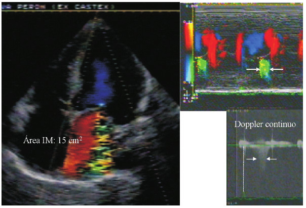 Izquierda: vista de 4 cámaras apical evidenciando jet de insuficiencia mitral (IM). Derecha: modo M color y Doppler continuo, mostrando que la duración de la regurgitación ocurre durante el tercio final de la sístole.