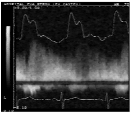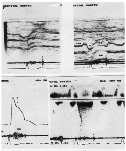 Izquierda: modo M mostrando válvula aórtica con esclerosis y apertura disminuida, sin gradiente por Doppler (parte superior); registro de pulso carotídeo con ascenso rápido y colapso temprano por la obstrucción subaórtica (parte inferior). Derecha: registro en modo M del movimiento anterior sistólico de la válvula mitral (parte superior); gradiente subaórtico telesistólico (parte inferior).