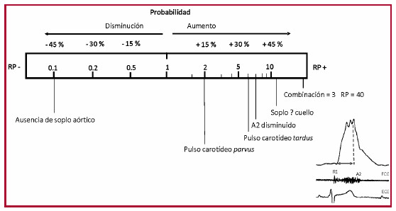 El examen físico basado en la evidencia trata de contestar estas preguntas comparando el examen físico con técnicas de diagnóstico aceptadas como referencia. Para ello se calcula la razón de probabilidad (RP) como el cociente entre la prevalencia del signo en pacientes con enfermedad documentada por determinada técnica y la prevalencia del signo en pacientes sin enfermedad.(2) En el caso del soplo sistólico de la estenosis aórtica, si está presente en el 50% de las estenosis verdaderas y en el 10% de los pacientes sin estenosis, la RP será de 8: RP = soplo presente en 80 % EAo verdaderas / soplo presente 10% sin EAo = 8.