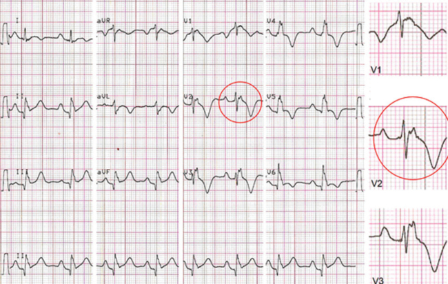 1.- Conforme a las modificaciones de la Task Force (1) presenta criterios mayores ecocardiográficos y de RMC estructurales, electrocardiográfico de despolarización, onda épsilon de V1 a V3, y criterio menor de anomalías de la repolarización como ondas T invertidas en derivaciones V1-V4 (o más), en presencia de bloqueo de rama derecha, compatible con el diagnóstico es miocardiopatía arritmogénica del ventrículo derecho muy avanzada.