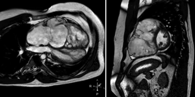 Se realizó resonancia magnética nuclear cardíaca (RMC) con inyección de gadolinio con resonador Achieva 1,5 Tesla. (Figura 2)