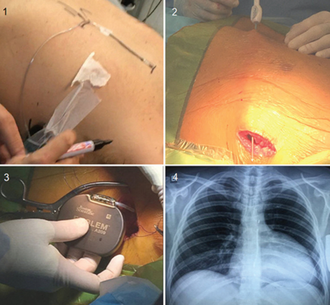 1: marcas cutáneas; 2: tunelización subcutánea; 3: implante del generador en línea axilar media; 4: Rx control.