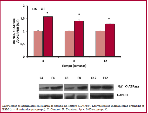 La actividad específica de la Na+, K+-ATPasa renal se incrementó significativamente desde la semana 4 de tratamiento con fructosa con respecto a las ratas controles (Tabla 1). El aumento de actividad fue acompañado por un aumento en la expresión proteica por western blot (Figura 1).