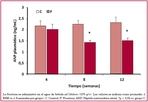 Results: Fructose overload was associated with a significant increase in insulinemia and systolic blood pressure levels and a decrease in urinary sodium excretion since week 4. A significant increase in L-dopa excretion and a decrease in dopamine excretion (increased urinary L-dopa/dopamine ratio) due to fructose overload were observed since week 4 with a decrease in plasma atrial natriuretic peptide at weeks 8 and 12. These changes were accompanied by increased activity and expression of Na+/ K+-ATPase, decreased A-type natriuretic peptide receptor and increased C-type natriuretic peptide receptor expression. Microalbuminuria was observed at week 12 of fructose overload.