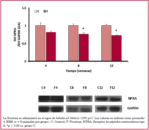 Expresión proteica de NPRA en los riñones de ratas controles y con dieta elevada en fructosa a las 4, 8 y 12 semanas de tratamiento.