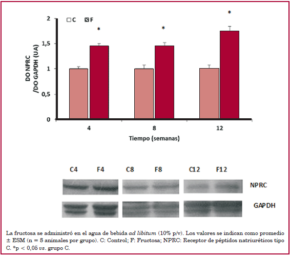 Se observó una disminución significativa de la concentración de ANP plasmático en las ratas con dieta elevada en fructosa en las semanas 8 y 12 de tratamiento (Figura 2). En los riñones, se encontró una disminución en la expresión de NPRA desde la semana 8 (Figura 3) junto con un aumento de expresión de NPRC desde la semana 4 de tratamiento (Figura 4).